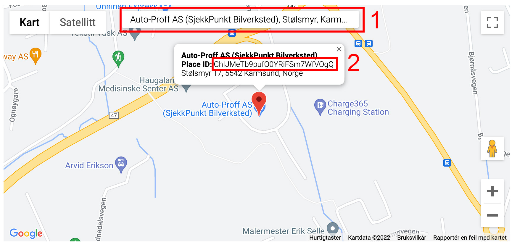 - Kopier Place ID: Feks. ChIJuUYJCKV6QUYRkTOhVY6z og legg den inn i feltet Place ID under kontaktinformasjon